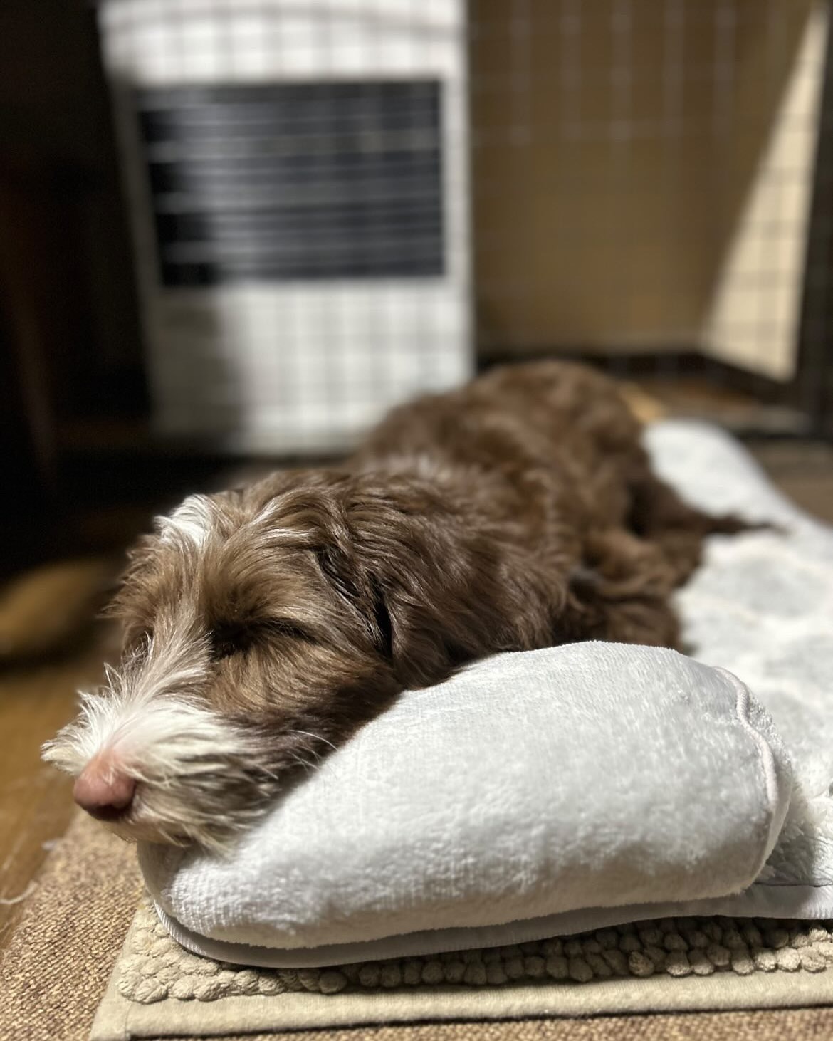遊び疲れるとストーブ前でゴロンとくつろぐ姿もたまらなく可愛いです😍